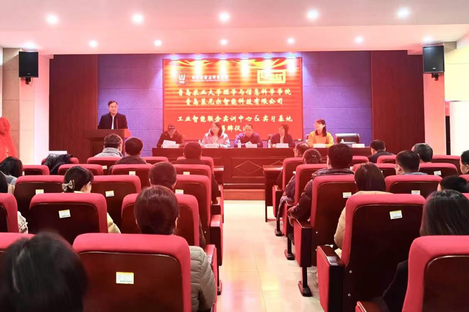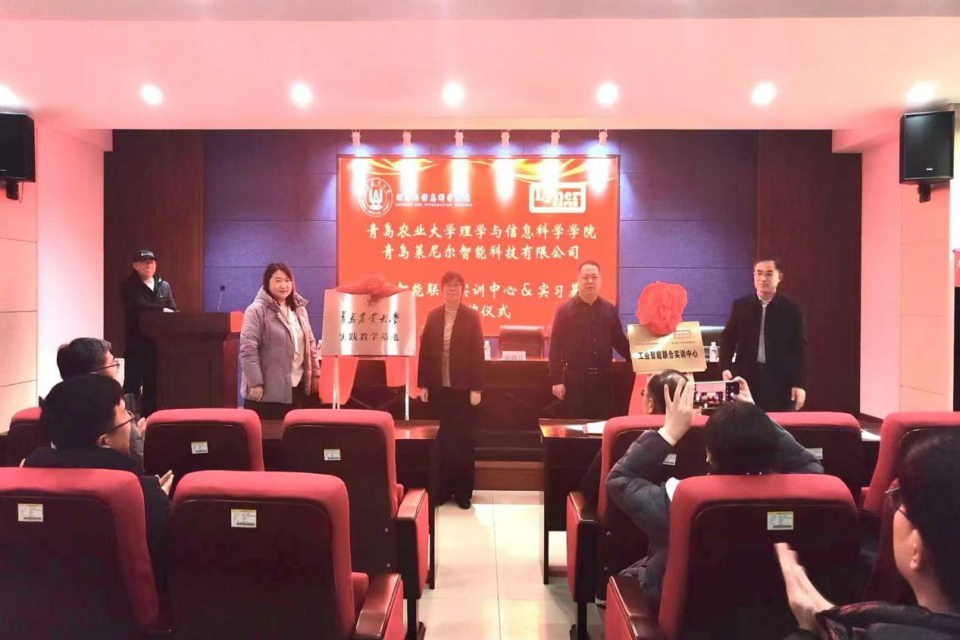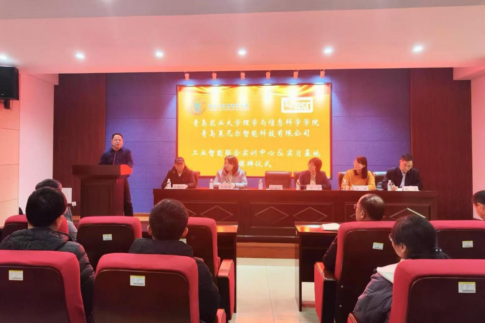为推进校企产教融合、协同育人,1月5日VSport体育和青岛莱尼尔智能科技有限公司在信息楼315举行工业智能联合实训中心暨实习基地揭牌仪式。青岛莱尼尔智能科技有限公司总经理孙锡亮、行政总监高妮妮,公司社会合作处副处长于宁、教务处实验实践教学科科长张婷、公司领导班子、各系部主任及电子信息系、计算机系老师参加,会议由公司经理徐鹏民主持。