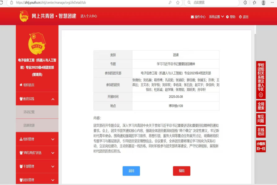 线上,各团支部通过“智慧团建”平台专题学习模块,组织团员青年深入研习回信精神,团员们积极参与,在规定时间内完成学习内容录入,并记录学习轨迹,展现出良好的学习态度和积极性。线下,各班级积极开展政治学习活动,通过主题团课、研讨交流等形式,深化对回信精神的理解。团员们踊跃发言,结合自身实际谈感悟,大家一致表示,要以戍边支教志愿者为榜样,将个人成长与国家发展紧密结合,勇担时代赋予的使命。