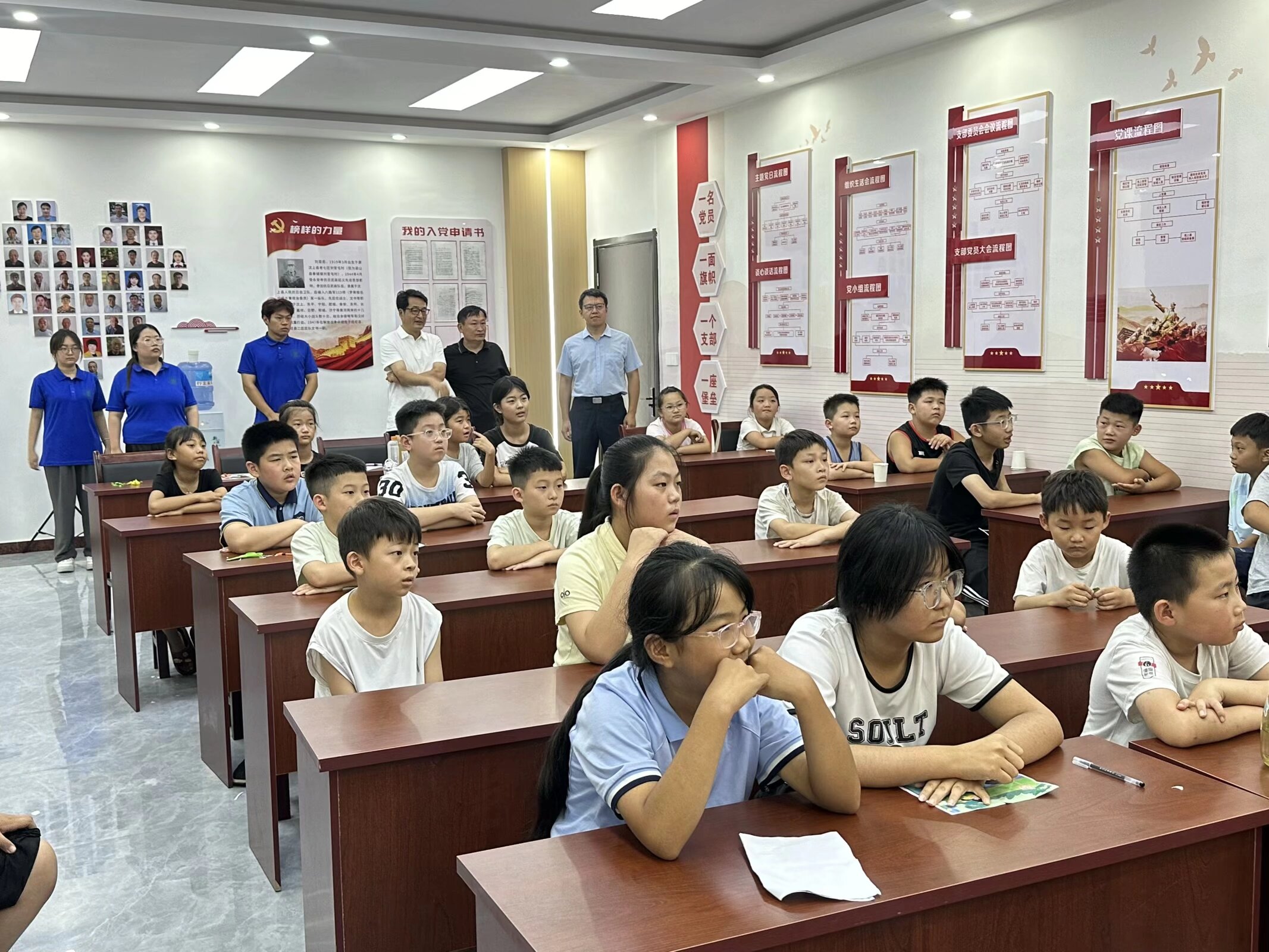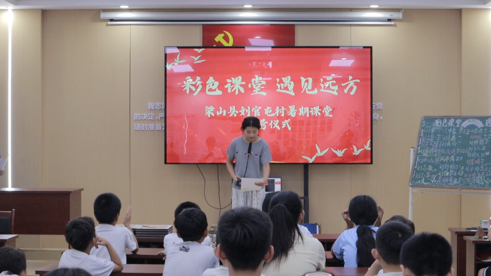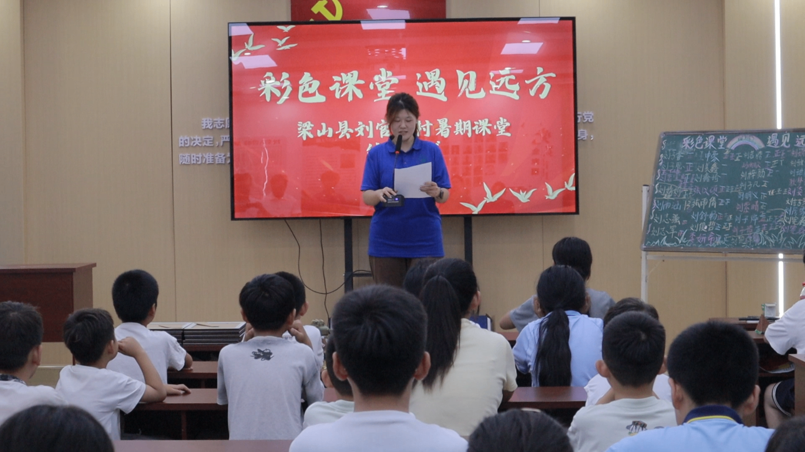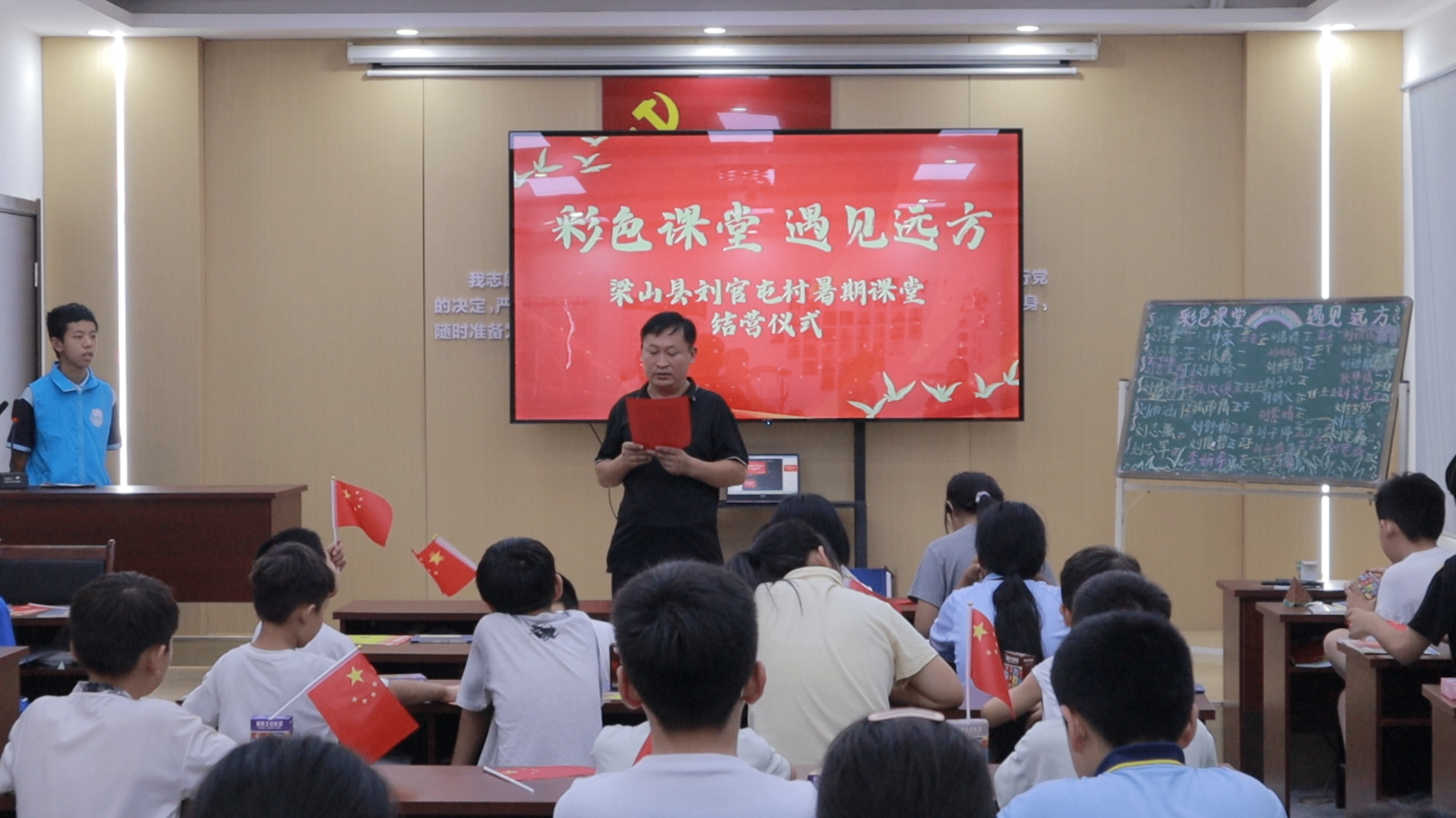 7月26日,VSport体育“同梁共进,智启动云乡途”赴济宁梁山支教服务团暑期彩色课堂结营仪式在刘官屯村村民委员会举行,山东省公安厅派驻拳铺镇刘官屯村第一书记罗双,梁山大义社会工作中心主任刘辉,梁山县拳铺镇刘官屯村党支部书记王峰,当地儿童和服务团成员参加仪式。